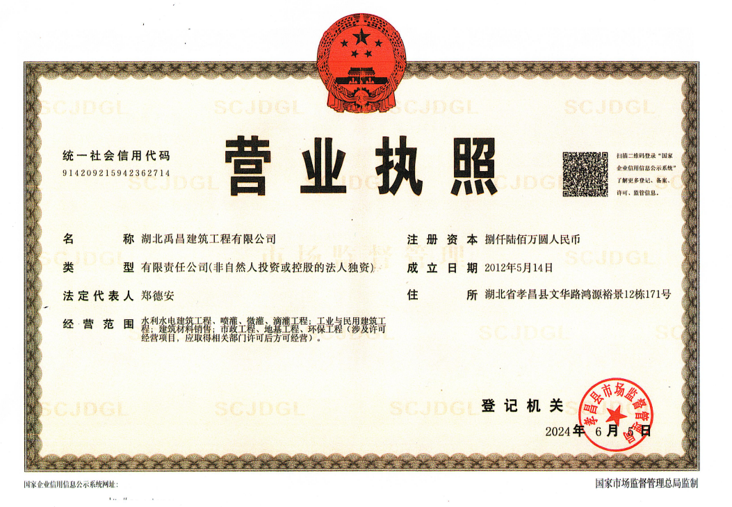 湖北禹昌建筑工程有限公司成立于2012年5月14日,是一家具备建筑二级、水利、市政工程总承包二级的资质建筑公司,主要负责水利水电建筑工程、喷灌、微灌、滴灌工程;工业与民用建筑工程;建筑材料销售;市政工程、地基工程、环保工程业务。